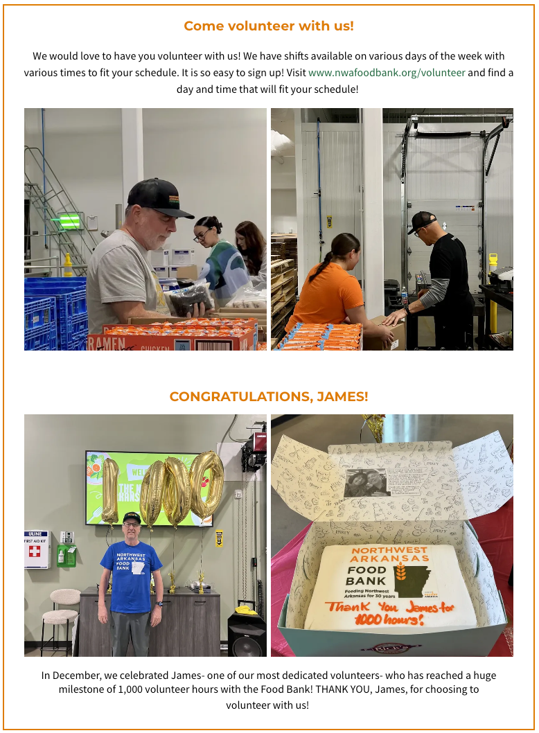 Anyone who has experienced true hunger knows how consuming it can be. That constant, painful, empty feeling leaves little room for anything else. It makes it hard for a child to focus in school, for an adult to stay clear-headed at work, or for a senior to be fully present in daily life. Your support of the Northwest Arkansas Food Bank does far more than provide a meal. Food restores focus. It creates stability. It gives people the chance to learn, work, and live with dignity. Food is the foundation. This work is urgent, and you are essential to its success. Thank you for standing with us and for your continued commitment to feeding Northwest Arkansas.