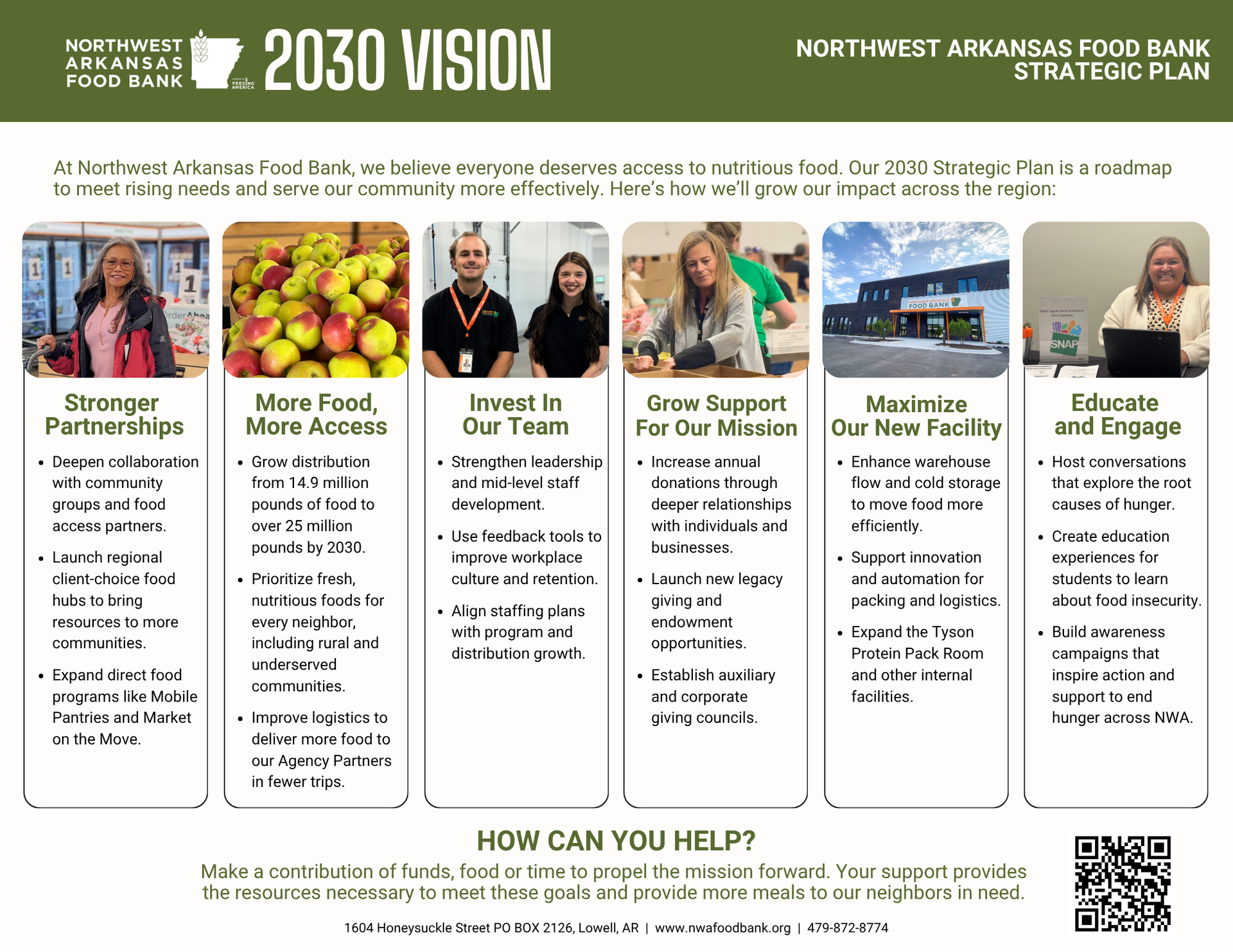 I know this month’s column is short, and I hope you will forgive me for my brevity. I’ve had a bit of a challenge getting my mind focused on what I want to say without focusing on the challenges we have faced the last thirty-plus days, so I am going to close now, but invite you to look elsewhere in this newsletter to see our public release of the 2030 strategic plan. As Northwest Arkansas continues to grow, your Northwest Arkansas Food Bank has to continue to grow to keep up with the growing demand. This plan positions us to do so.