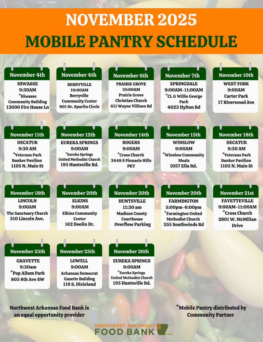 member of the media how the changes in Washington are impacting us. Unlike many great organizations that help make Northwest Arkansas a better place to live, we do not receive any government funding so cut backs do not directly impact our operating funds. As I referenced above, the amount of TEFAP Food, while important to our neighbors is an amount that we can make up with purchase product if necessary. Changes to SNAP will go into effect in October of 2027 so how that will impact us remains to be seen. However, the current Government shutdown could have an immediate effect on those who receive SNAP benefits and WIC benefits. So indirectly, the Government shutdown might have an impact on the Food Bank. It is important to note that we are committed to not letting our neighbors suffer. With your help we can weather this political storm just as we weathered the tornado of 2024, and weathered economic swings since 1988. Thank you to all the supporters who have asked if we need additional financial support during this time.