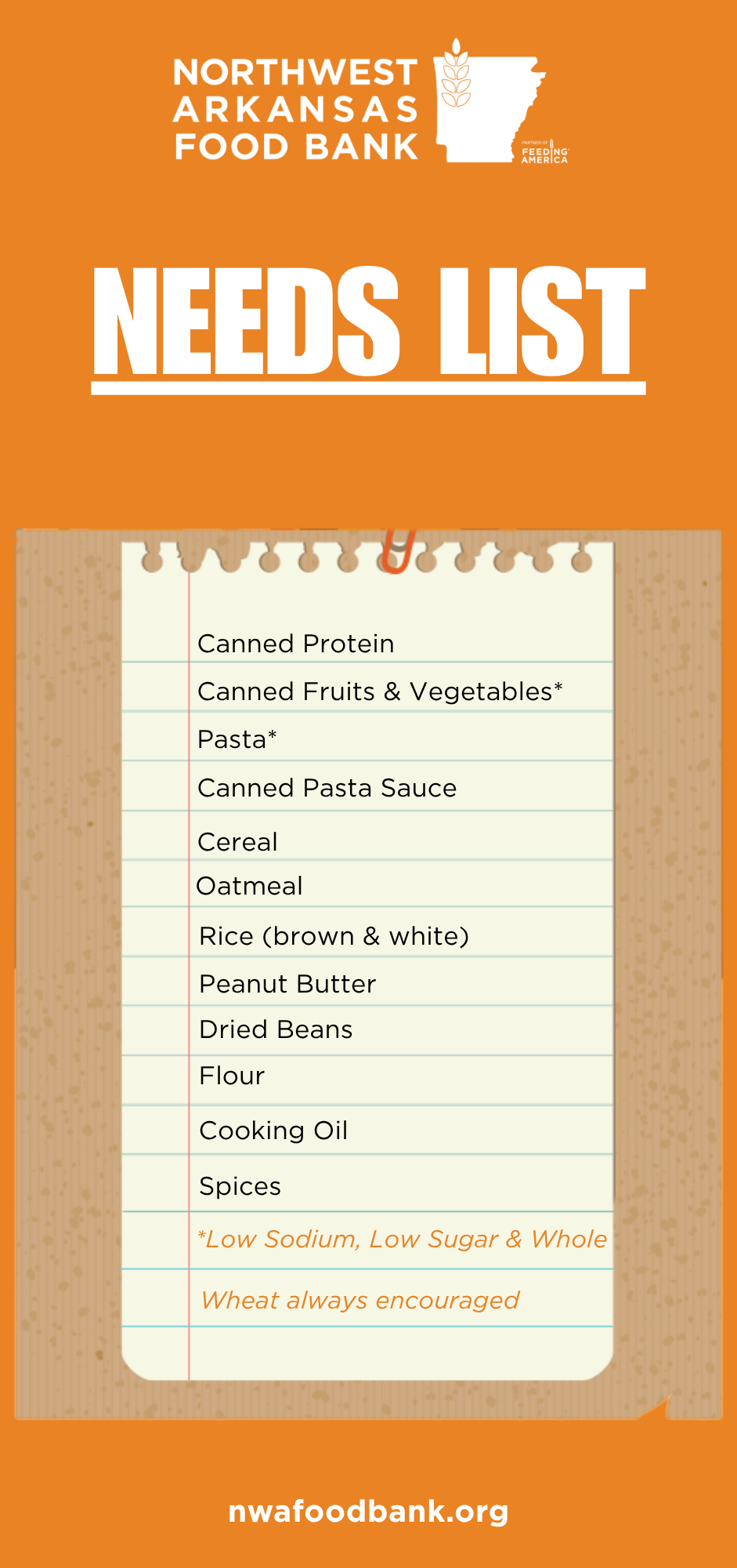 Food drives help provide food to those in need in our community. No food drive is too small to make an impact on our community! We would love to partner with you and your coworkers/friends/family to make an impact on the NWA community. For more information please contact